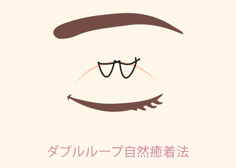 ダブルループ自然癒着法は、医療用の極細糸を使用しまぶたの内側で長めの特殊なループ状に固定する施術方法です。点ではなく“面で支える構造”に近いため、ラインの安定性が高く、長期的なキープ力が期待できます。